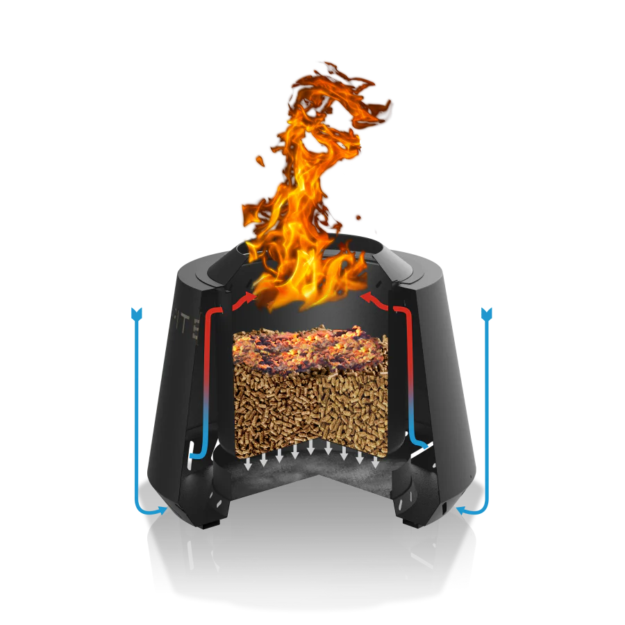 Featuring a large, two-piece base, this unit comes in a heavy duty four-piece construction consisting of an exterior burner shell, an integrated ash pan, a removeable windshield and an easy-lift, 11.5-inch burn chamber. The base has four holes in the bottom to bring fresh air up around the burn pot where oxygen rich air mixes with unburned gas where a secondary clean burn occurs, resulting in a nearly smokeless fire. It is excellent for heating outside and is very travel friendly as it is lightweight and durable. It also includes a custom-fit cover.